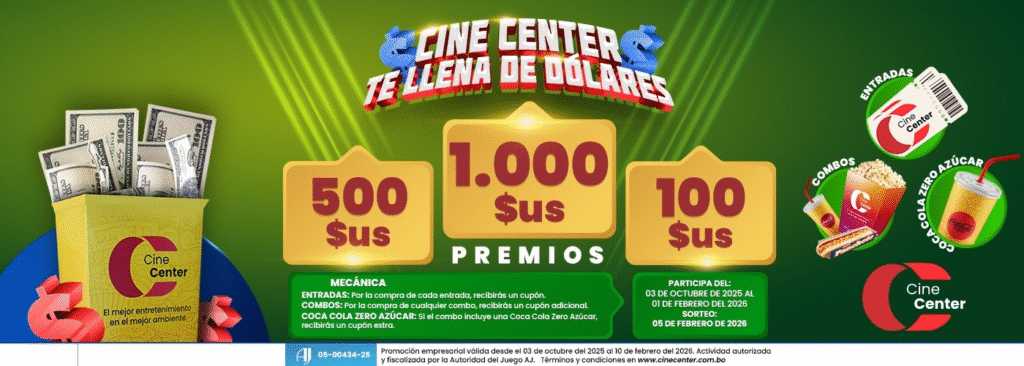 La mecánica es sencilla: por cada entrada o combo comprado en cualquiera de los complejos Cine Center del país, el cliente recibe un cupón que debe llenar con sus datos personales y depositar en los buzones habilitados. Todos los cupones participarán en un sorteo final que se realizará el 5 de febrero de 2026 en Santa Cruz de la Sierra, con premios en efectivo de 1.000, 500 y 100 dólares estadounidenses. El evento será transmitido a nivel nacional y contará con la presencia de un notario de fe pública.